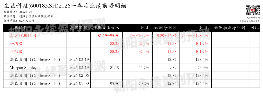 截至2026年03月23日,根据朝阳永续季度业绩前瞻数据: