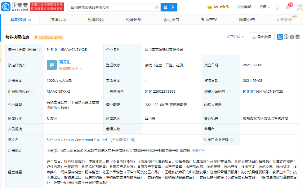 企查查APP显示,9月8日,四川莲花调味品有限公司成立,法定代表人为曹家胜,注册资本为1000万元人民币,公司经营范围含检验检测服务;道路货物运输;食品添加剂销售;水产品零售;水产品收购等。