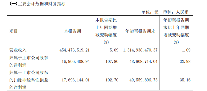 近日,莲花健康(600186)发布了2022年第三季度报告。第三季度实现营业总收入4.54亿元,同比下降5.09%;归母净利润1690.64万元,同比增长107.80%,环比下降1.99%;扣非净利润1769.31万元,同比增长102.70%。基本每股收益为0.0094元,同比增长10.88%。