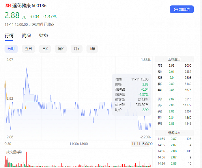 今日收盘2.88元/股,开盘价为2.93元,较昨日下跌1.37%,换手率为2.36%,总市值51.66亿。
