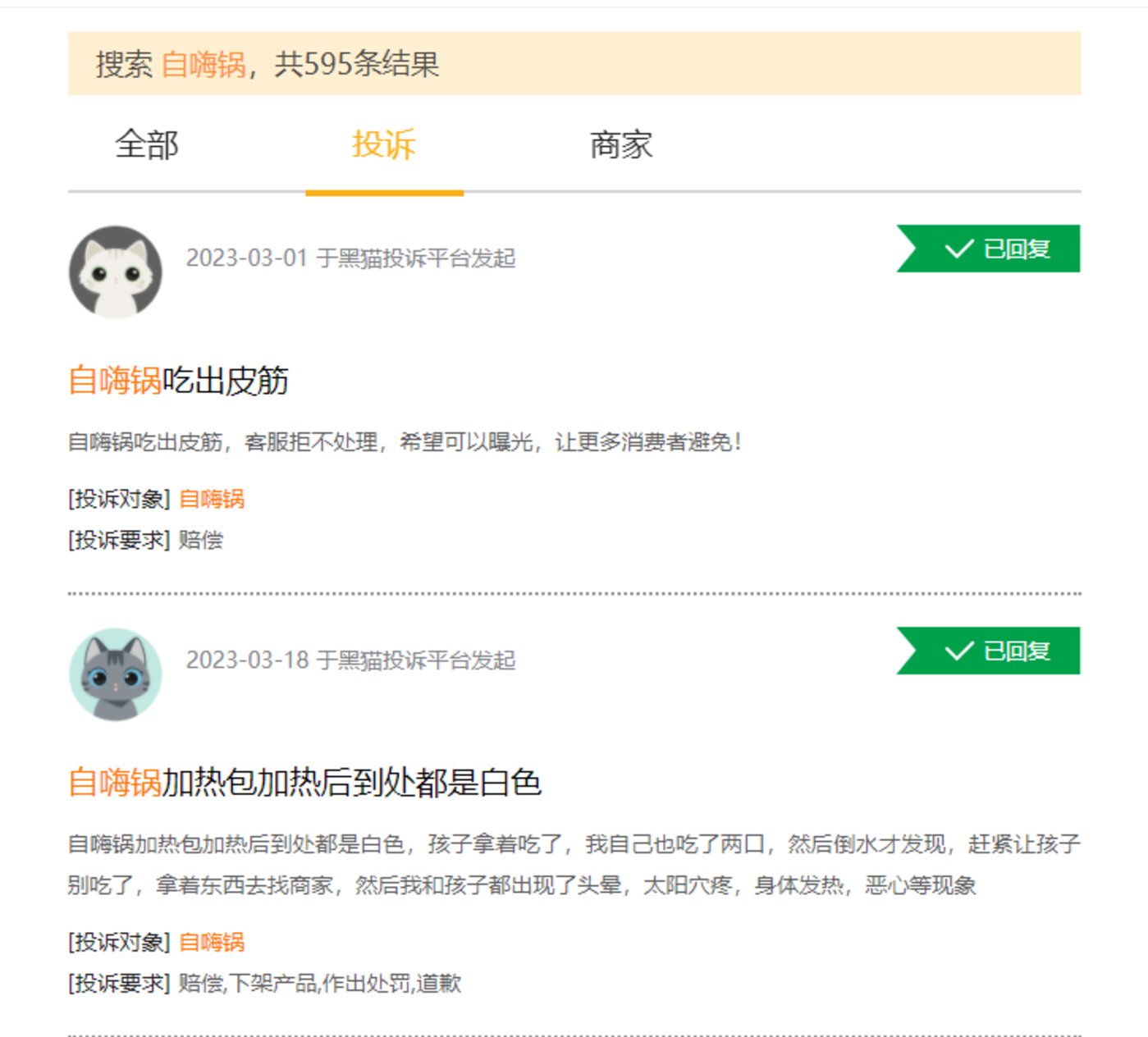 尽管“自嗨锅”名声在外,但其也曾多次陷入食品安全风波。另外,在黑猫投诉平台搜索“自嗨锅”,共有投诉信息近600条,其中大多是“吃出皮筋”“吃出虫子”“吃出毛发”“肉变质”等食品安全问题。