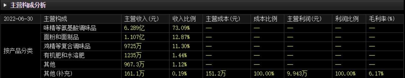 钛媒体APP注意到,2022年上半年,莲花健康实现营业收入8.6亿元,同比增长1.16%,实现归属净利润3190.23万元。具体而言,味精依旧是莲花健康的主要营收来源,而复合调味品业务占比依旧不高。2022年上半年,莲花健康味精等氨基酸调味品实现主营收入6.29亿元,占营收比重为73.09%;面粉和面制品实现主营收入1.11亿元,占比约12.87%;鸡精等复合调味品实现主营收入9725万元,收入比例为11.3%。从具体财务数据来看,莲花健康的复合调味品业务的推进尚未见成效。