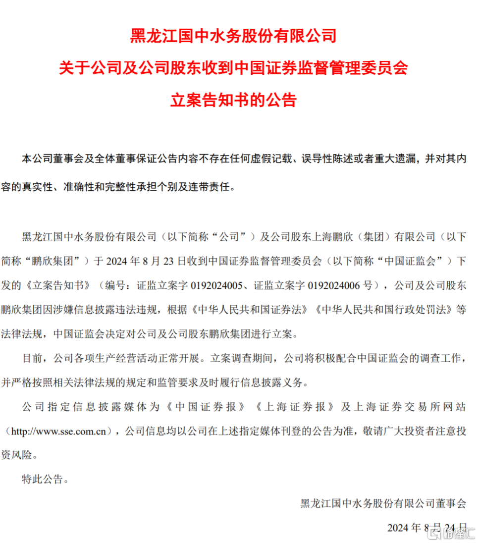 消息面,8月23日,国中水务及其股东上海鹏欣(集团)有限公司因涉嫌信息披露违法违规,收到了中国证监会的《立案告知书》。同时这已是本月内第二次被立案,14日,已经锁定面值退市的鹏都农牧公告,公司及控股股东鹏欣集团因涉嫌信披违规收到《立案告知书》。