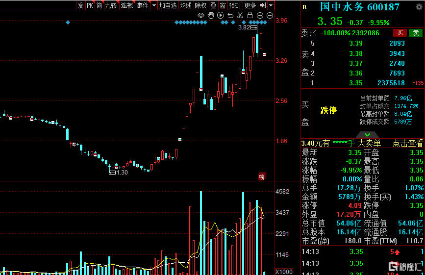 8月26日,国中水务一字板牢牢锁死跌停,截至发稿,股价报3.35元/股,封单超237万手,成交额超5700万元。