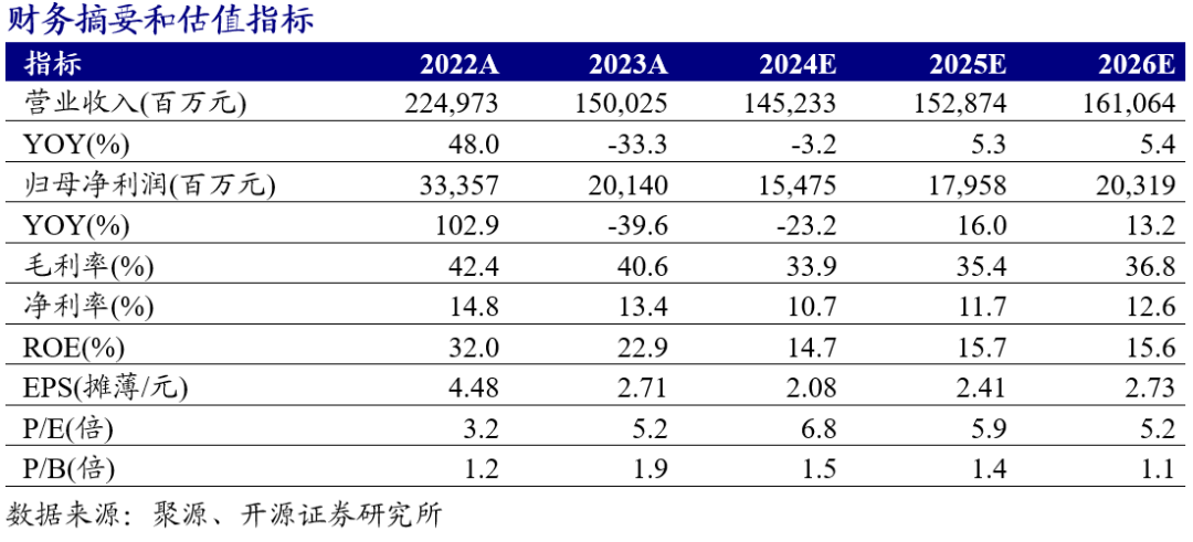公司发布2024年中报,2024H1公司实现营业收入723.1亿元,同比-24.1%;实现归母净利润75.7亿元,同比-31.6%;实现扣非归母净利润73.0亿元,同比-27.4%;单Q2看,实现营业收入326.8亿元,环比-17.6%,实现归母净利润38.1亿元,环比+1.5%,实现扣非归母净利润36.3亿元,环比-1.0%。考虑煤价下行,我们下调盈利预测,预计2024-2026年归母净利润为154.8/179.6/203.2(原值210.6/238.7/268.0)亿元,同比-23.2%/+16.0%/+13.2%;对应EPS分别为2.08/2.41/2.73元;对应当前股价PE为6.8/5.9/5.2倍。公司作为国际化龙头煤企,率先制定长期发展规划,明确新能源新材料等转型方向,看好未来成长潜力,此外公司提高分红承诺有望提升投资价值,维持“买入”评级。