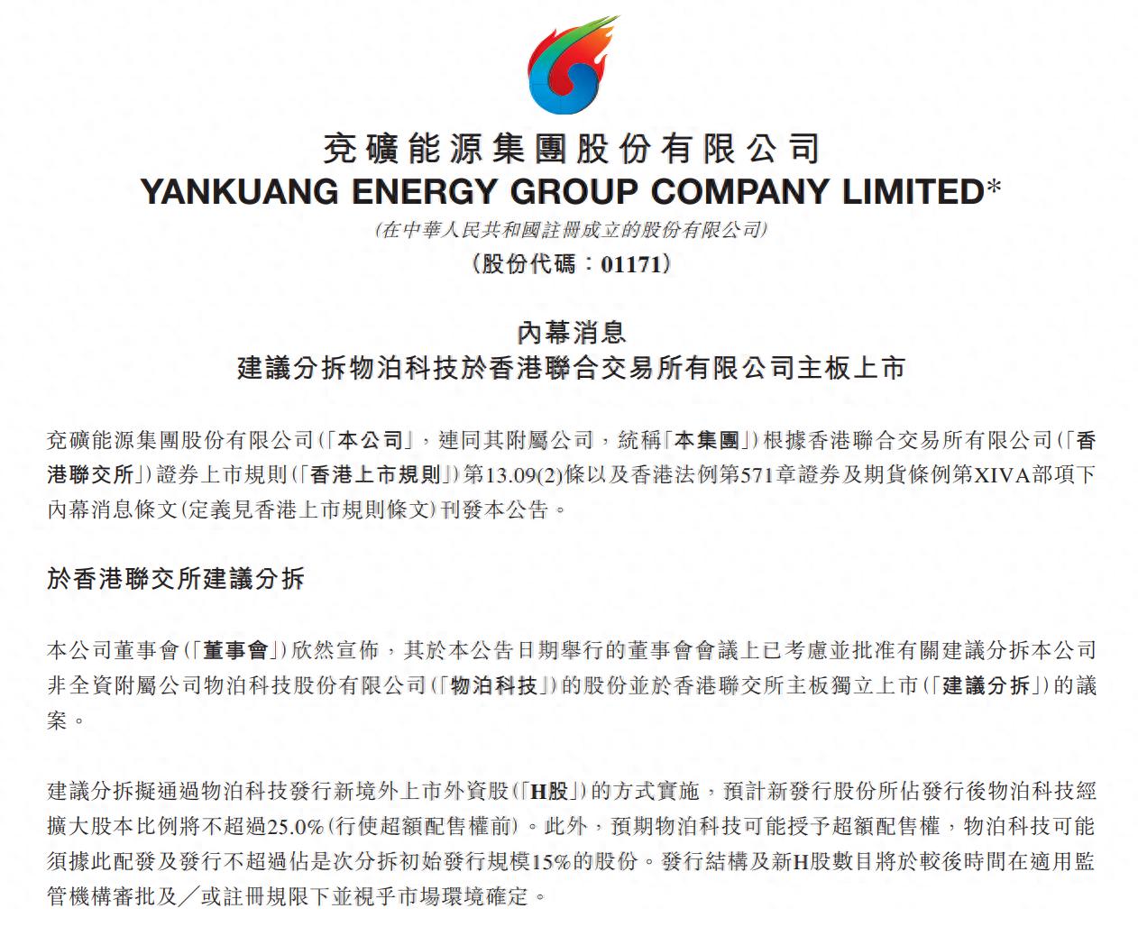3月27日,兖矿能源集团股份有限公司(以下简称“兖矿能源”)发布公告称,董事会已考虑并批准有关建议分拆公司非全资附属公司物泊科技股份有限公司(以下简称“物泊科技”)的股份并于香港联交所主板独立上市的议案。