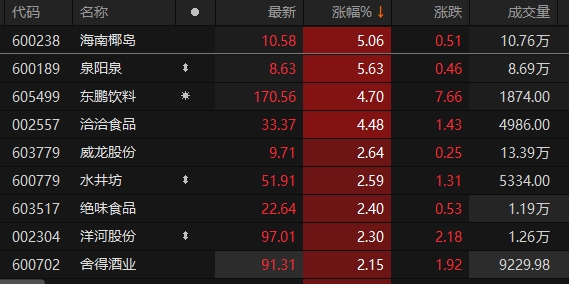 A股食品饮料板块快速拉升 海南椰岛、泉阳泉涨超5%