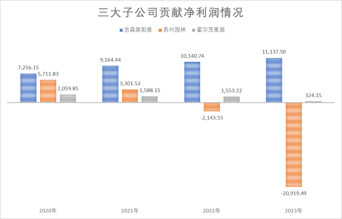 2020年-2023年,吉森泉阳泉饮品有限公司净利润贡献规模分别为7256.15万元、9164.44万元、1.01亿元和1.11亿元。而苏州工业园林和霍尔茨家居贡献净利润逐步减少,2022年-2023年,苏州工业园林连续亏损,2023年亏损规模达2.09亿元。