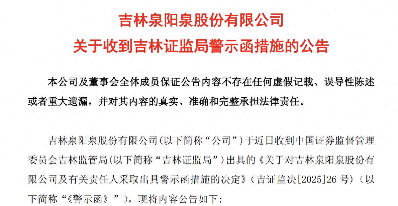 吉林证监局决定对泉阳泉、姜长龙、王尽晖、金明采取出具警示函的监管措施,并记入证券期货市场诚信档案。