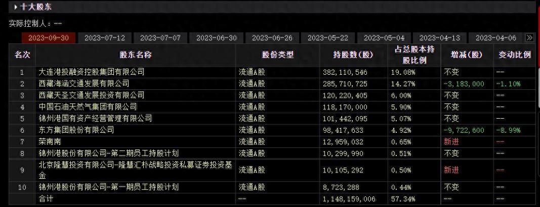 界面新闻注意到,根据锦州港披露的2023年三季报,公司第二大股东西藏海涵交通发展有限公司(下称“西藏海涵”)持有公司股份数量约为2.86亿股,占公司总股本的14.27%。而半年报显示,西藏海涵持股数为2.89亿股,占比14.43%。也就是说,三季度内西藏海涵实际减持了约0.03亿股。