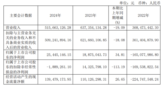 华资实业昨晚披露的2024年年度报告显示,公司全年营业收入为5.16亿元,同比下降19.09%;归母净利润为0.25亿元,同比增长34.81%;扣非净利润为-188.93万元,同比下降113.19%;经营活动产生的现金流量净额为1.39亿元,同比增长26.65%。