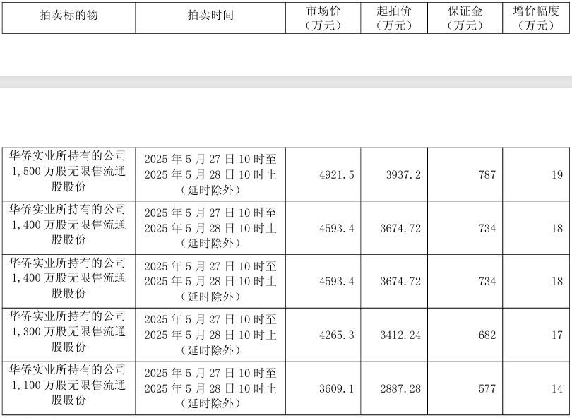 4月23日,创兴资源(SH600193)公告称,公司近日收到杭州市上城区人民法院(以下简称“上城区法院”)的通知书,法院将于5月27日10时至5月28日10时在淘宝网司法拍卖网络平台上,对控股股东浙江华侨实业有限公司(以下简称“华侨实业”)所持公司6700万股(占其所持上市公司股份的65.90%,占上市公司总股本的15.75%)进行公开拍卖。
