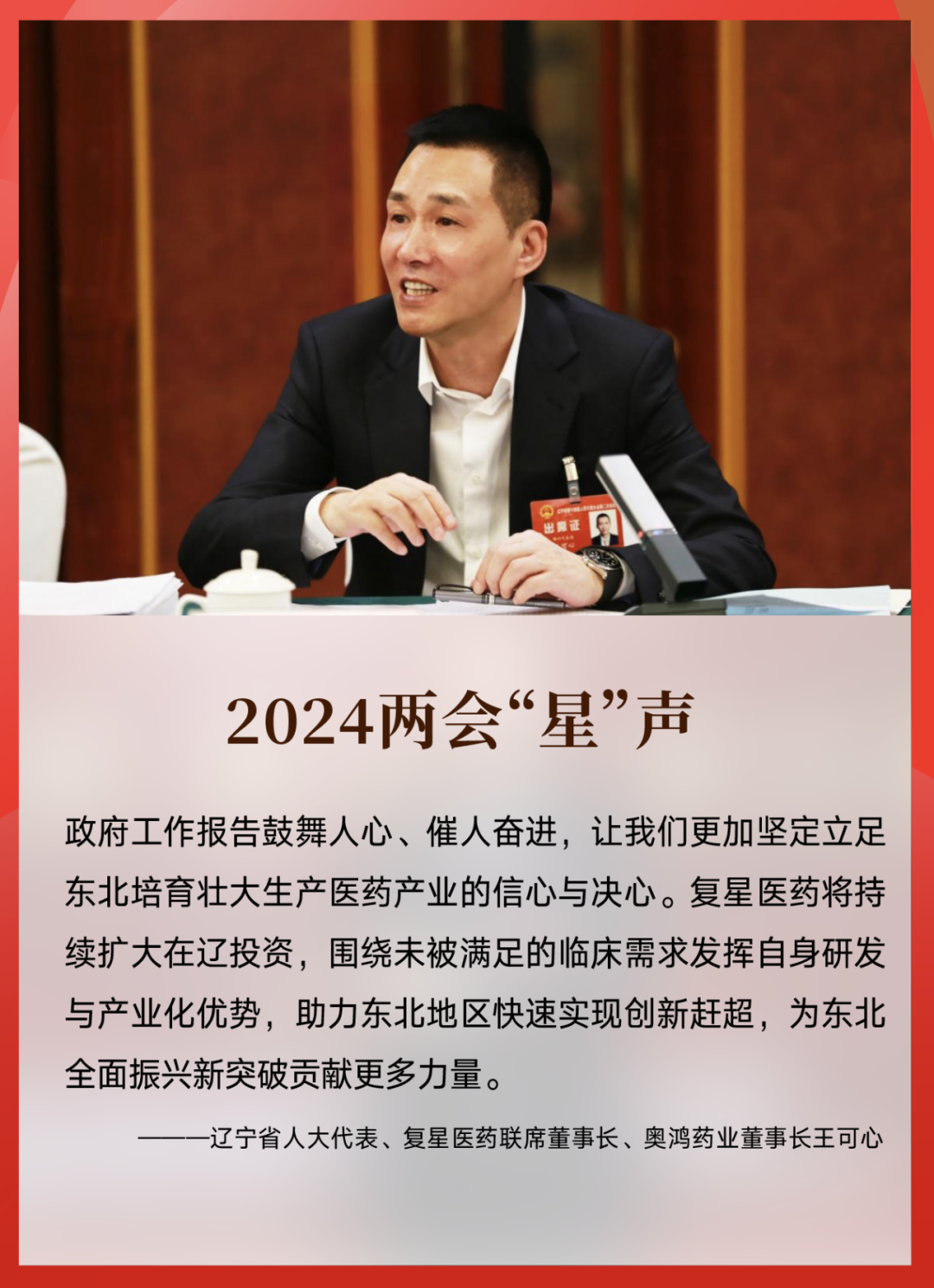 2024年1月23日至26日,辽宁省第十四届人民代表大会第二次会议在辽宁人民会堂举行。辽宁省人大代表、复星医药联席董事长、奥鸿药业董事长王可心出席会议并为辽宁省生物医药产业转型升级和高质量发展建言献策。