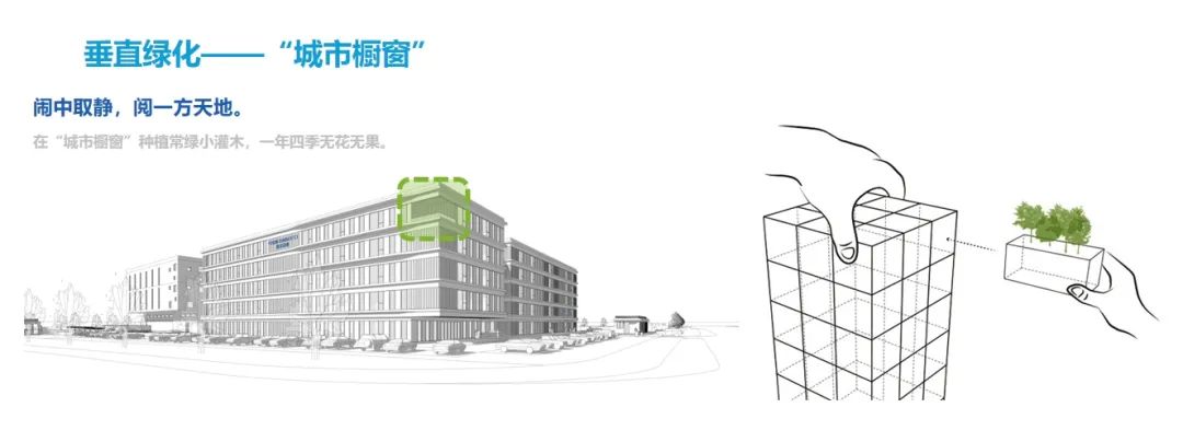 位于西南角五层有一处开放式“城市橱窗”,在其中种植常绿小灌木,闹中取静,阅一方天地,提升整体建筑的精致感,呼应了复星诊断活泼创新的办公氛围。
