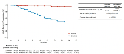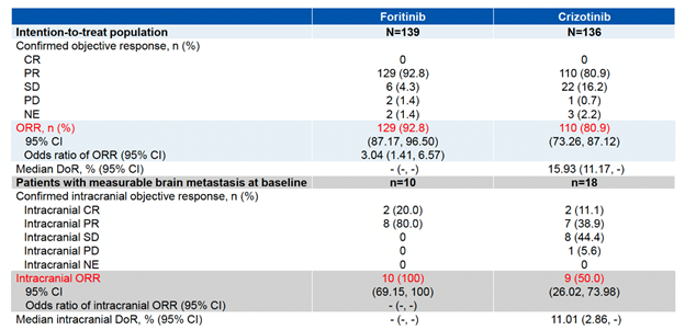 同时,研究结果显示复瑞替尼治疗组的ORR达到92.8%,相较于克唑替尼治疗组提高12%(P=0.0035);且对于基线脑转移的患者,复瑞替尼治疗组的颅内ORR可达到100%,而克唑替尼治疗组为50%(表1)。