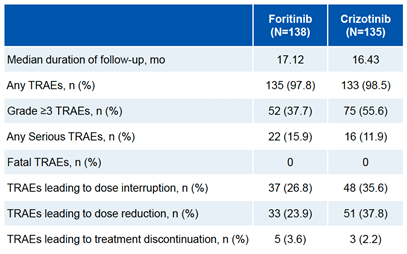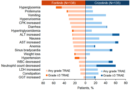 安全性方面,复瑞替尼治疗组患者3/4级治疗相关不良事件(TRAEs)的发生率为37.7%,克唑替尼治疗组为55.6%。复瑞替尼治疗后最常见的3/4级TRAEs为高血糖、高血压和QT间期延长。复瑞替尼治疗组未观察到间质性肺病或视力下降。两组患者治疗后均未报告致死性TRAE(表2 图6)。