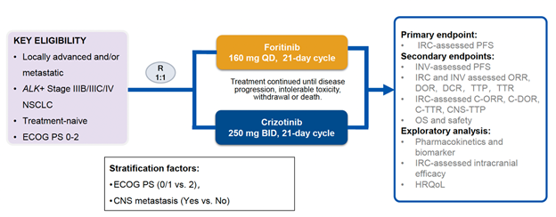 REMARK研究是一项开放标签、随机、III期临床研究,纳入了既往未经治疗的ALK阳性晚期NSCLC患者。患者根据基线ECOG评分(0/1 vs 2)和是否发生CNS转移进行分层分析,并按1:1比例随机分为接受复瑞替尼治疗(160 mg,每日一次)或克唑替尼治疗(250 mg,每日两次)。研究主要终点为由独立评审委员会(IRC)评估的无进展生存期(PFS),次要终点包括由研究者(INV)评估的PFS和客观应答率(ORR);由IRC和INV评估的应答时间(TTR)和应答持续时间(DOR);由IRC评估的颅内 ORR(C-ORR)、颅内TTR(C-TTR)、颅内DOR(C-DOR)和所有受试者至CNS进展时间(CNS-TTP);以及总生存期(OS)和安全性(图1)。