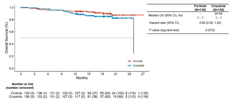 此外,相比于克唑替尼,复瑞替尼显著降低CNS进展风险。克唑替尼治疗组中位CNS-TTP为19.32个月,而复瑞替尼组尚未达到(HR 0.04, 95% CI 0.01-0.14,图4)。另外,复瑞替尼有改善OS的趋势(HR 0.60, 95% CI 0.30-1.20,图5)。