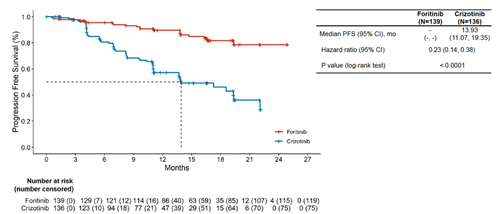 研究发现,复瑞替尼治疗组的PFS相较于克唑替尼治疗组具有显著改善,克唑替尼治疗组的中位PFS为13.93个月,而复瑞替尼治疗组尚未达到(HR 0.23, 95% CI 0.14-0.38,图3)。