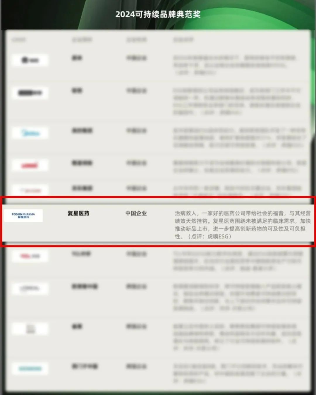 凭借多年来在ESG领域的持续深耕,复星医药MSCI ESG评级提升至A级,荣登中央广播电视总台“ESG卓越实践30强”、央视“长三角ESG·先锋50”、福布斯中国2024中国ESG50榜单等。