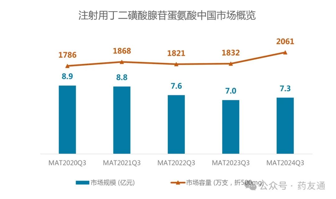 腺苷蛋氨酸在中国的上市剂型包括:冻干粉针、肠溶片,均为医保乙类。IQVIA数据显示,注射用丁二磺酸腺苷蛋氨酸市场规模7.3亿元,市场容量超2000万支(以500mg计)。