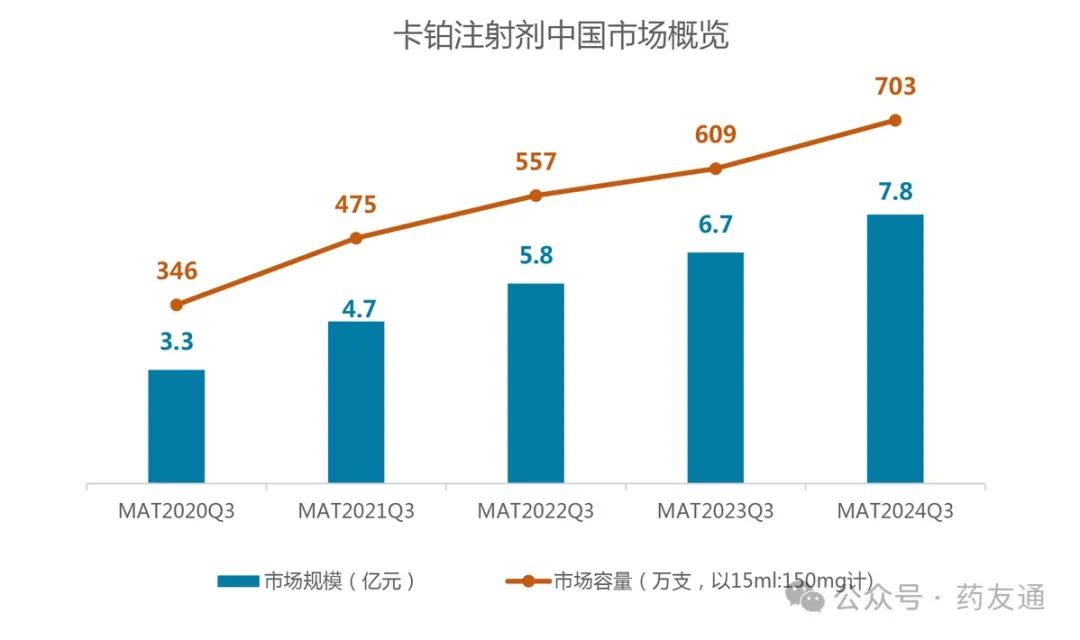 卡铂在中国的上市剂型包括:冻干粉针、注射液,均为医保甲类。卡铂注射剂尚未纳入国家集采,近年市场持续增长,IQVIA数据显示,市场规模已增至7.8亿元,市场容量超700万支(以15ml:150mg计)。
