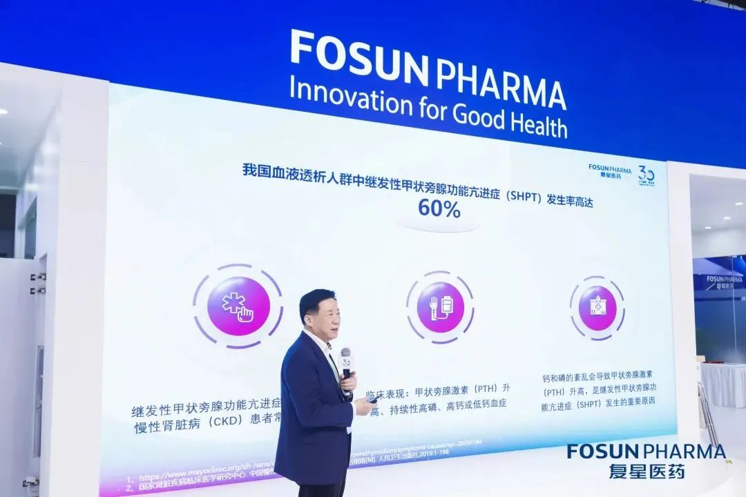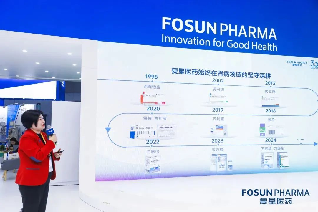 活动期间,复星医药国内营销平台联席总裁刘焰女士介绍了复星医药的肾病产品管线。刘焰女士表示,复星医药作为一家植根中国、创新驱动的全球化医药健康产业集团,长期在肾病领域深耕,以先进的治疗方案为驱动力,不断布局各种药物矩阵,尤其聚焦开发和引进创新药。先后上市了注射用重组人促红素(CHO 细胞)、注射用低分子量肝素钠、聚苯乙烯磺酸钙散、盐酸依特卡肽注射液等诸多全新机制、突破创新的药品,筑就了复星医药肾病领域的强大护城墙。