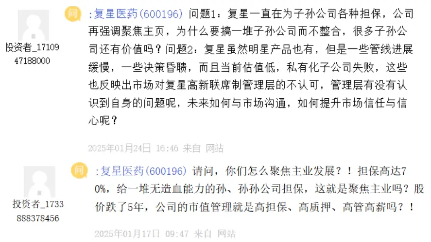 此外,在上交所官方上证e互动平台上,也有投资者针对复星医药质押率与担保金额过高可能带来控制权风险以及债务风险等的问题表达了关切。