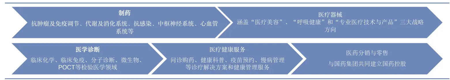 目前,复星医药直接运营的业务包括制药、医疗器械、医学诊断、医疗健康服务,并通过参股国药控股覆盖到医药商业领域。