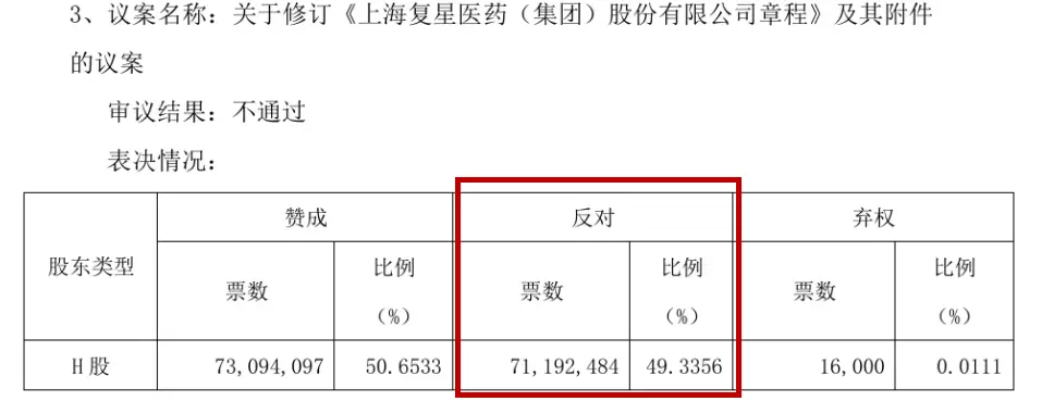 而就在同期召开的2024年第一次H股类别股东会上,复星医药关于修改公司章程的议案,因出席的H股股东所投反对票超过三分之一而被否决。