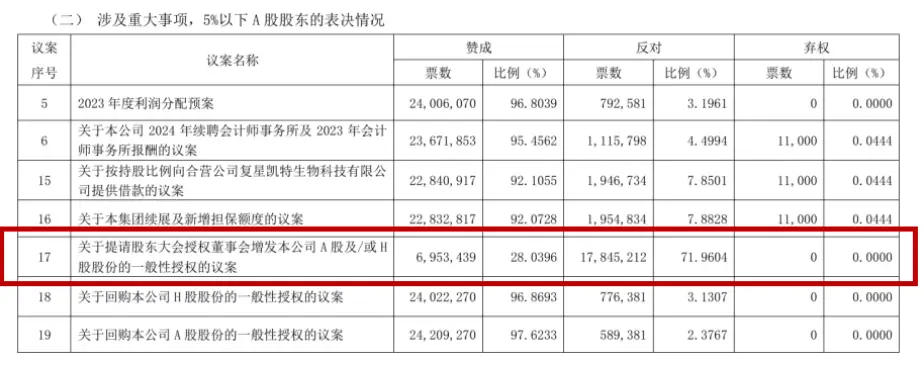 2024年6月,复星医药举行的2023年年度股东大会上,《关于提请股东大会授权董事会增发本公司A股及/或H股股份的一般性授权的议案》虽获审议通过,但仍有超过30%的H股股东投下反对票。此外,由于议案涉及重大事项,按上交所相关规则,需要对A股中小投资者单独计票并披露。而据5%以下A股股东表决情况显示,反对比例超过70%。