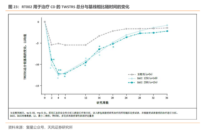 中位疗效持续时间达24周,RT002持久改善患者症状。达希斐?于2023年8月14日获得美国FDA批准,用于治疗颈部肌张力障碍。全球III期和中国III期临床研究(ASPEN-CN)的汇总研究结果证实了达希斐?在中度至重度原发性颈部肌张力障碍成人中的疗效和安全性,中位疗效持续时间可达24周,与其在眉间纹的III期临床研究和上肢痉挛的II期研究结果中表现出的“长效”特征一致,中位疗效持续为24~28周。