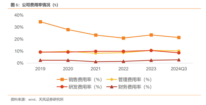 2024 年前三季度,由于新冠销售团队优化调整、资源整合,销售团队人效提升,销售费用率下降至21.33%;剔除新并购企业影响,管理费用同口径下降约3亿元,管理费用率下降为10.17%;聚焦优势管线,优化研发项目管理和资源分配,实现高效的成果转化和创新产品的持续落地,在自研投入的同时,充分践行开放式研发模式,通过产业基金等方式开展研发项目的孵化和投入,确保创新研发的可持续性,研发费用率下降为8.57%;由于美元加息、升值等因素及计息债务规模变化,财务费用率上升为2.76%。