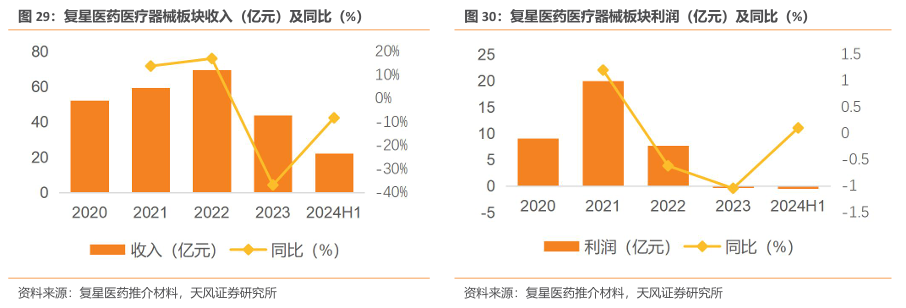 收入上,医疗器械板块2024H1实现收入为20.69亿元(yoy-6.72%),剔除新冠相关产品后收入同比增长4.97%,实现恢复性增长。利润方面,2024H1实现利润-0.54亿元(2023H1实现利润1.14亿元,同比减少1.68亿元),主要系:(1)新冠抗原、核酸检测试剂收入大幅下降;(2)医学诊断产品销售未达预期;(3)复锐医疗科技(Sisram)部分区域分销转直销过程中运营成本上升。