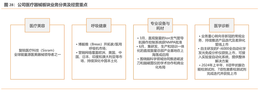 公司医疗器械板块主要分为医疗美容、呼吸健康、专业设备和耗材及医学诊断四大板块。(1)医疗美容:复锐医疗科技是全球能量源医美器械领导者之一。(2)呼吸健康:博毅雅医疗在医用呼吸机市场有开拓,营销网络覆盖多个国家和地区,并持续深化中国本土化。(3)专业设备和耗材:直观复星总部产业基地落地上海,围绕脑科学领域推进学术协作和商业化布局。(4)医学诊断:业务重心转向非新冠常规业务,自主研发产品获批上市,多种检测试剂完成迭代并获批上市。