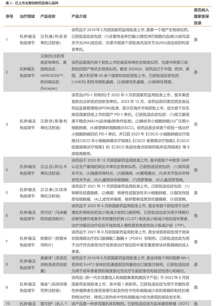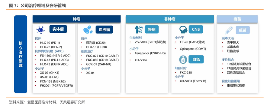 核心治疗领域布局广泛,在研管线亮点颇多。公司目前在实体瘤、血液瘤、慢病、CNS、自免、疫苗领域均有布局,其中HLX-10(PD-1)、HLX22(HER2 单抗)、HLX-43(PD-L1 ADC)等品种均有较大潜力。