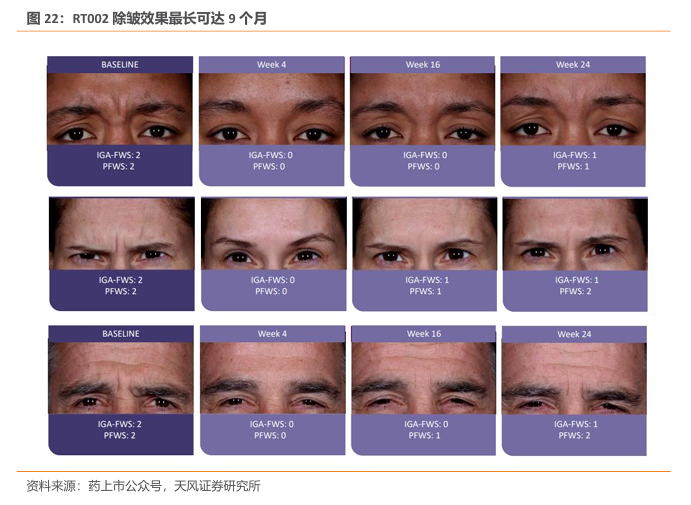 RT002 为新一代A型肉毒杆菌素,中位疗效可达9个月。RT002是一种基于Revance公司专有技术平台开发的新型、下一代、长效神经调节物,药物活性成分为daxibotulinumtoxinA型肉毒杆菌毒素。该产品通过阻断神经冲动,暂时抑制造成皱纹的肌肉运动,使皮肤更光滑,更清爽。根据公开信息,RT002的制剂中不含有人血来源的物质或动物来源的蛋白,可以在无需冷藏的条件下保持两年稳定性。重要的是,它具有持久的活性,中位疗效持续时间达到6个月,在有些参与者中一次注射的疗效可维持9个月。
