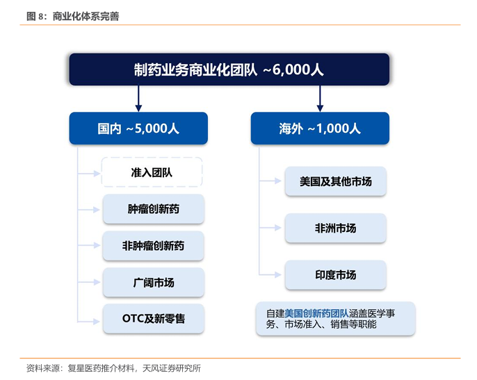 拥有成熟、全球化营销体系,管理持续完善。截至2024Q3,公司制药业务商业化团队约6000 人,其中国内约5000人,下属肿瘤创新、非肿瘤创新、广阔市场、OTC及新零售四个部分。海外团队约1000人,主要分为美国及其他市场、非洲、印度市场。公司在美国已经自建创新药销售团队,涵盖医学事务、市场准入、销售等职能。