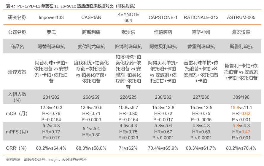 ASTRUM-005 研究显示斯鲁利单抗在 ES-SCLC 中最长的 OS 数据。以往免疫疗法对ES-SCLC 患者获益有限,阿替利珠单抗和度伐利尤单抗治疗SCLC仅带来2个月左右的生存改善。ASTRUM-005 研究作为国际多中心临床研究,证实斯鲁利单抗联合化疗用于ES-SCLC 一线治疗具有PFS和OS的显著获益。2022年欧洲肿瘤内科学会亚洲峰会(ESMO ASIA)上更新近20个月的随访数据显示,斯鲁利单抗联合化疗组在疗效及安全性上拥有明显优势。2022年欧洲肿瘤内科学会亚洲峰会(ESMOASIA)上更新近20个月的随访数据显示,斯鲁利单抗联合化疗组ITT人群中位OS已经达到15.8个月,较对照组生存获益超过4个月,这是目前为止ES-SCLC一线治疗所有药物中取得的最好成绩,中位PFS为5.8 个月,较化疗提升了1.5个月。此外,风险比(HR)为0.47,疾病进展风险降低53%。亚裔人群中位OS达到15.9个月,在疗效及安全性上拥有明显优势。