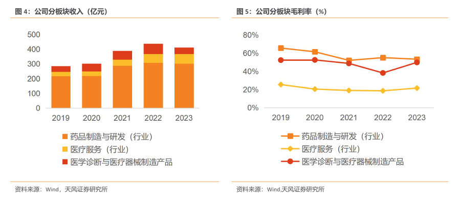 2023 年,制药业务创新产品收入稳健增长,实现收入302.22亿元,毛利率53.38%;医疗器械与医学诊断业务由于新冠抗原、核酸检测试剂收入大幅下降,实现收入43.9亿元,毛利率49.86%;医疗健康服务业务保持增长态势,实现收入66.72亿元,毛利率21.6%。