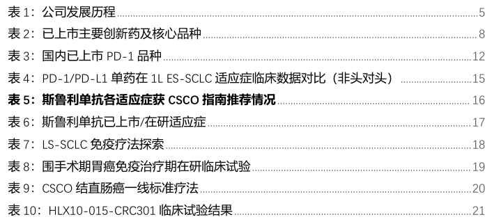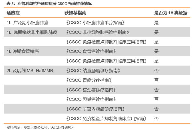临床获益明显,斯鲁利单抗获多部CSCO指南推荐。斯鲁利单抗凭借在肺癌、食管癌、肠癌等领域优异的临床疗效,荣获2023年《CSCO 小细胞肺癌诊疗指南》、《CSCO非小细胞肺癌诊疗指南》、《CSCO 食管癌诊疗指南》、《CSCO结直肠癌诊疗指南》和《CSCO免疫检查点抑制剂临床应用指南》等9部指南推荐。在小细胞肺癌(SCLC)领域,斯鲁利单抗以临床研究中卓越的疗效和良好的安全性于2022年首次入选《CSCO 小细胞肺癌诊疗指南》,并在《CSCO小细胞肺癌诊疗指南(2023版)》中作为I级推荐(1A类证据)用于广泛期小细胞肺癌(ES-SCLC)一线治疗,成为该指南首个且唯一被推荐一线治疗ES-SCLC的国产抗PD-1单抗;此外,在非小细胞肺癌(NSCLC)方面,斯鲁利单抗表现同样亮眼,其联合白蛋白紫杉醇和卡铂被《CSCO非小细胞肺癌诊疗指南(2023版)》新增推荐作为晚期鳞状非小细胞肺癌(sqNSCLC)一线治疗I级推荐;在食管癌诊疗方面,斯鲁利单抗首次入选《CSCO食管癌诊疗指南(2023版)》,即以最高推荐等级、最强证据类别获得推荐联合顺铂+5-氟尿嘧啶(5-FU)用于一线治疗PD-L1CPS≥1的远处转移性食管鳞癌(ESCC)患者(I级推荐,1A类证据)。