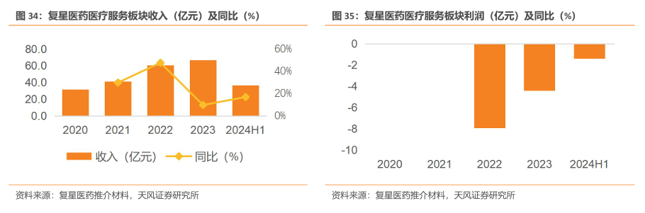 收入上,医疗服务板块2024H1实现收入为36.6亿元(yoy+17%),2020-2023年收入CAGR达28.1%。利润方面,2024H1实现利润-1.4亿元(2023H1实现利润-2.68亿元,同比减亏1.28 亿元),主要系:(1)线上业务进一步聚焦;(2)优化支出;(3)药械集中采购带来降本增效。