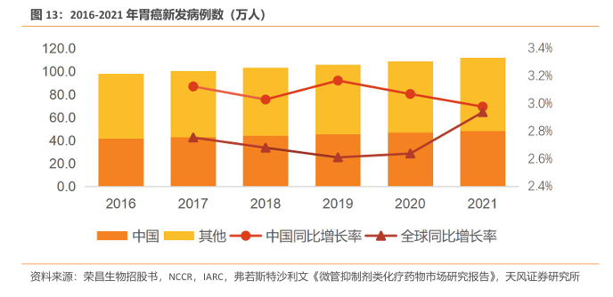 弗若斯特沙利文数据显示,全球及中国胃癌患者逐年增加,其中中国胃癌发病人数占全球总发病人数的40%以上。2016年中国胃癌新增病例达41.6万人,全球胃癌新增病例达98万人。公司预计2025年中国及全球新发胃癌患者将达54.6万人及125.6万人。