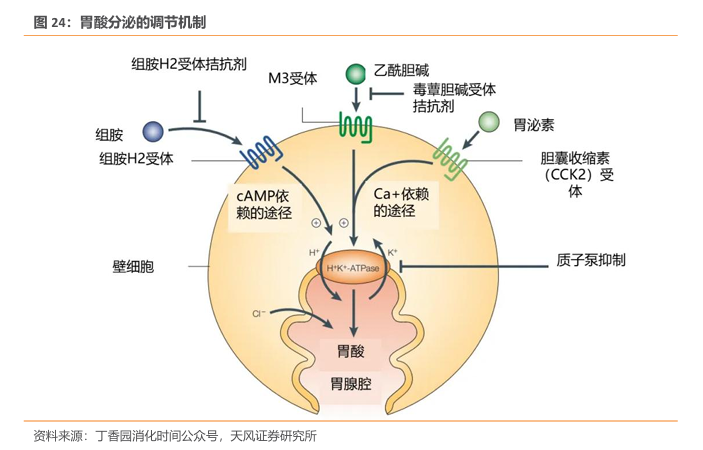 酸相关疾病是消化领域常见的一类疾病,近年来其发病率呈上升趋势,严重影响患者的生活质量。胃酸的分泌是一个多机制精确调节的过程,位于壁细胞基底外侧膜的组胺受体(H2R)、乙酰胆碱受体(M3R)或胆囊收缩素受体(CCK2R)受到各自配体的刺激而激活,从而启动信号转导通路,激活酸分泌的最后一步——H+/K+-ATP酶。抑酸药物通过调节壁细胞上不同的靶目标从而实现酸抑制。