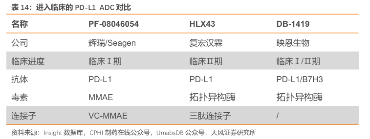 PD-L1 与ADC联系较少。作为一个免疫治疗药物,PD-L1抗体只要与PD-L1结合,阻碍其结合PD-1,就能产生免疫治疗的作用。但作为ADC,PD-L1抗体必须要被靶细胞内化进入溶酶体,才能将搭载的细胞毒性药物释放出来,产生ADC的治疗作用,而目前上市的PD-L1 抗体无法被细胞内化。