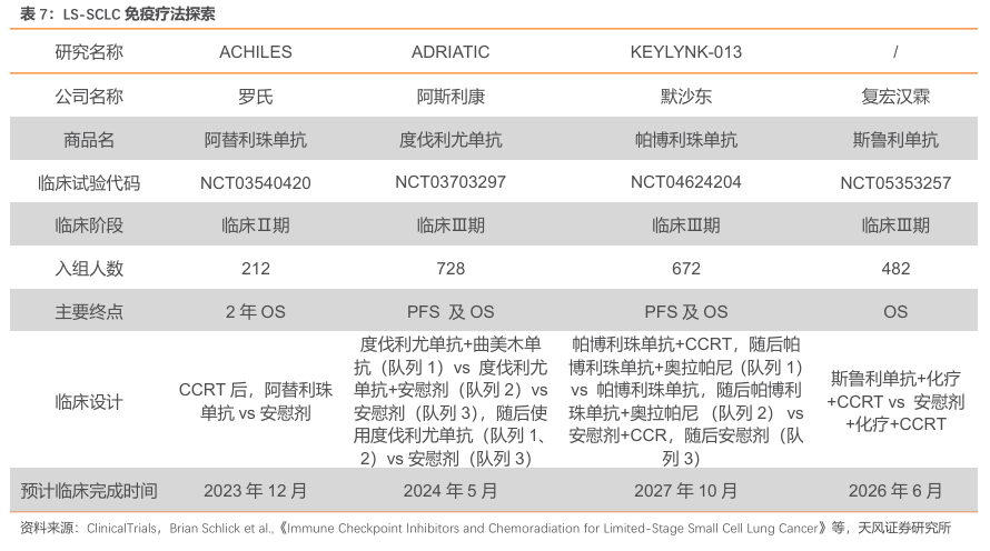 化疗仍是局限期小细胞肺癌标准治疗方案。目前,化疗联合同步放化疗(CCRT)是局限期小细胞肺癌(LS-SCLC)的标准治疗。由于约一半的患者远处转移性疾病的治疗抵抗和胸部复发率极高,局限期SCLC应用CRT的生存率较低。目前,ACHILES研究、ADRIATIC研究、KEYLYNK-013 研究等正积极探索以免疫疗法为基础的治疗方案在LS-SCLC中的疗效与安全性。