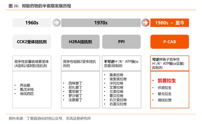 抑酸药物已经历数次迭代,P-CAB优势明显。20世纪 80年代出现了一类新抑酸药物,即钾离子竞争性酸阻滞剂(P-CAB)。P-CAB 具有与 PPIs 相似的作用机制,但与 PPIs 不同,P-CAB 可与 H+/K+- ATP 酶可逆结合,半衰期长且更高效。