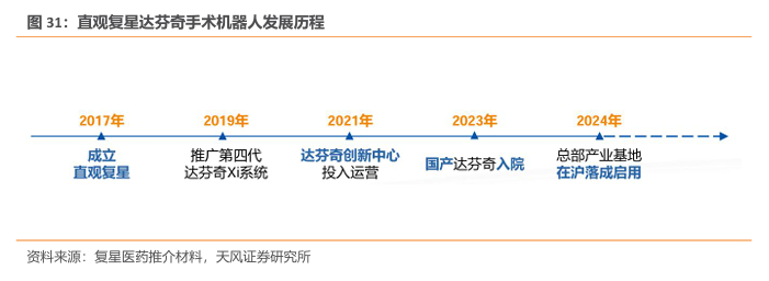 直观复星的本土化生产手术达芬奇机器人于2023年获批上市。2017年,复星医药与Intuitive Surgical(直觉外科)在中国组建合资公司-直观复星。2019年起开始推广第四代达芬奇Xi系统,2023年6月14日,国家药监局网站的医疗器械批准证明文件送达信息发布中,出现了直观复星的“胸腹腔内窥镜手术控制系统“,注册证编号“国械注准20233010800”,这意味着本土化生产的达芬奇手术机器人正式获批上市。2023年12月国产达芬奇手术机器人进入商业化时代,2024年总部产业基地在沪落地启用。