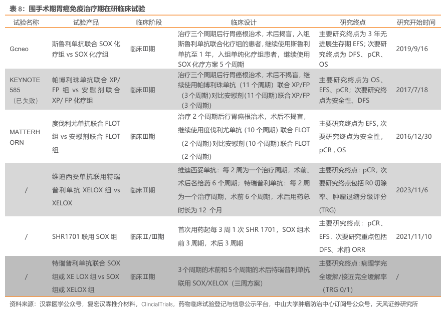差异化临床试验设计,用药时间有望达20周期。据Checkmate649试验(纳武利尤单抗)受试者基线数据分析,60%晚期胃癌患者CPS≥5。因此针对斯鲁利单抗围手术期胃癌适应症的临床试验在设计伊始即提前锁定PD-L1阳性(CPS≥5)人群,使斯鲁利单抗有望成为全球首个,国内唯一胃癌围术期免疫药物。目前胃癌围术期标准治疗中位无事件生存期约3年,如试验成功,预计大部分患者使用斯鲁利单抗时间将可达20周期(方案规定最长使用时间)。