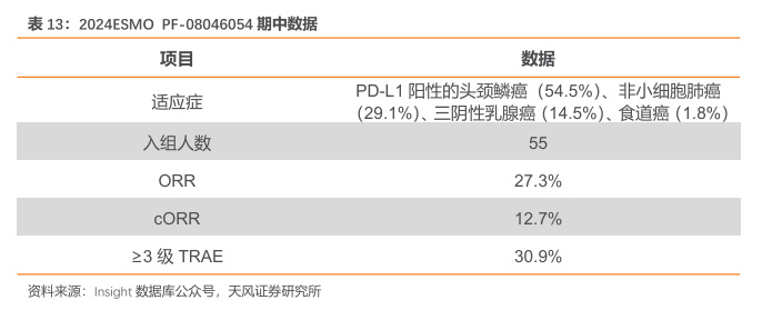 2024ESMO 会议,PF-08046054 的临床数据再次更新。数据显示:(1)基线方面,截至2024 年 3 月6日,55名患者接受了治疗(PD-L1阳性),54.5%患有头颈部鳞状细胞癌(HNSCC),29.1%患有非小细胞肺癌(NSCLC),14.5%患有三阴性乳腺癌(TNBC),1.8%患有食道癌(EC)。